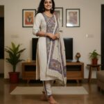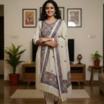 - Dupatta: A soft, matching Khadi cotton dupatta finished with artfully fringed edges and an eye-catching, hand-painted Mithila border.