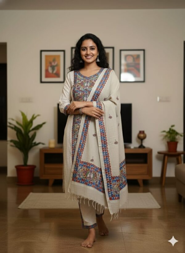 Step out in a masterpiece with our Khadi Cotton Salwar Kurti and Dupatta set, featuring authentic, intricate Mithila (Madhubani) hand-painting. Originating from the Mithila region of India, this ancient folk art transforms your attire into a story. The vibrant, narrative motifs are carefully hand-painted across the Kurti and the borders of the Dupatta, ensuring no two pieces are exactly alike.