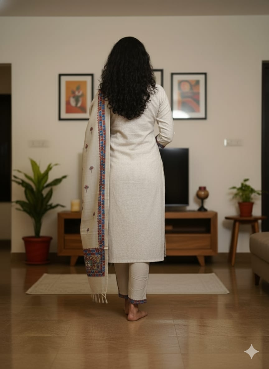 Step out in a masterpiece with our Khadi Cotton Salwar Kurti and Dupatta set, featuring authentic, intricate Mithila (Madhubani) hand-painting. Originating from the Mithila region of India, this ancient folk art transforms your attire into a story. The vibrant, narrative motifs are carefully hand-painted across the Kurti and the borders of the Dupatta, ensuring no two pieces are exactly alike.