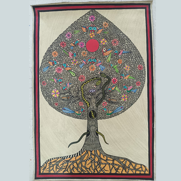 Profound Symbolism: The Tree of Life is a universal motif, representing growth, interconnectedness of all living things, stability, fertility, and immortality. In this Madhubani depiction, it flourishes with colorful birds (representing freedom and spirit), a snake (symbolizing rebirth and protection), and intricate patterns in its roots and canopy.